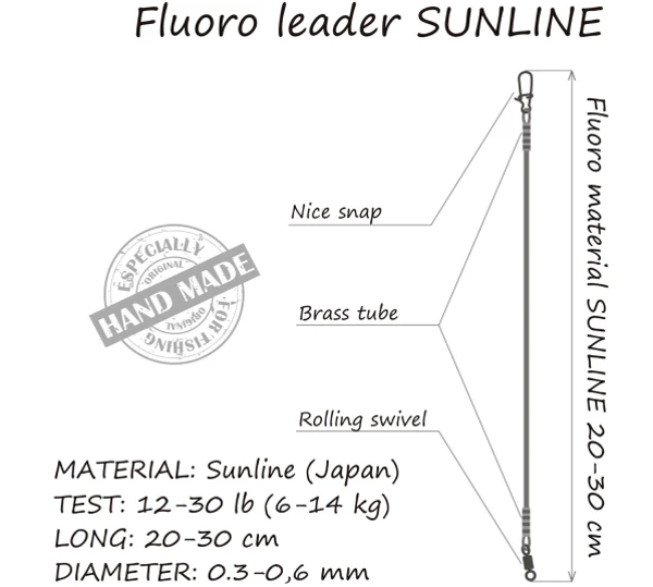 Deze fluoro leader is gemaakt van hoogwaardig Sunline (Japan) fluorocarbon. Het is eigenlijk nagenoeg onzichtbaar in het water, wat onmisbaar is bij het vangen van voorzichtige vissen in helder water. De leader is bestand tegen slijtage en aanbevolen voor het vangen van baars en snoekbaars. Verder is de leader voorzien van een stevige speldwartel.