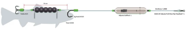 Deze kant-en-klare onderlijn is speciaal ontworpen voor het vissen op meerval met een grote aasvis in een stromende rivier. De float is nauwkeurig af te stellen zodat je gemakkelijk op de gewenste hoogte vist. De 1mm dikke monolijn en de oersterke haken zorgen ervoor dat je zonder problemen de grootste vissen kunt landen!