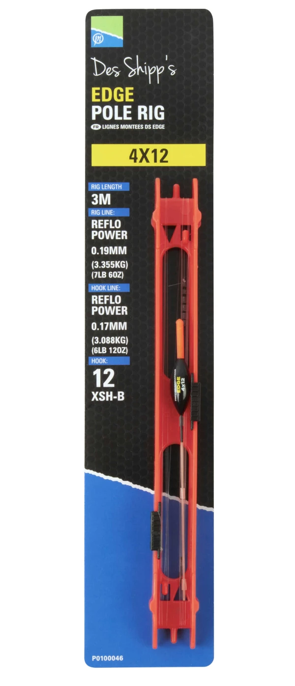 De Preston Des Shipp’s Edge Pole Rig is een zeer hoogwaardige rig voor het vissen op zowel witvis als karper met de vaste stok. Deze rig bestaat uit lijn, dobber, loodhagels en een haak. Hierdoor is de rig gelijk klaar voor gebruik. De rig beschikt over een stevige, ruime maat 12 haak. Verder is de rig beschikbaar in drie verschillende dobber groottes. Verder beschikt de rig over een 0,19mm lijndikte van Reflo Power. Hierdoor is de lijn stevig genoeg om in combinatie met topelastiek karper te landen. De dobber van de rig heeft een 2,5mm drijflichaam en een glasvezel steel. De loodkogels op de lijn zijn op optimale wijze gepositioneerd zodat aanbeten zo goed mogelijk geregistreerd kunnen worden. De haken aan deze rig zijn XSH-B haken waardoor deze rig ideaal is voor het vissen met wormen, maïs of pellets.