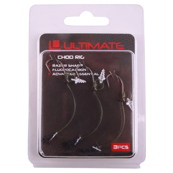 Deze kant-en-klare Chod Rig is gemaakt van fluorocarbon en afgewerkt met hoogwaardige componenten. De chod rig is perfect voor het vissen met pop ups boven plantenbedden en modder, maar kan voor elk bodemtype gebruikt worden. Elke montage is uitgerust met een ‘bait screw’ een handige schroef waar je snel en eenvoudig je pop up of boilie aan kunt bevestigen en waarmee je altijd zeker bent van een goede aaspresentatie. De Ultimate Chod Rig wordt verpakt per 3 stuks en is verkrijgbaar in meerdere lengtes en haakmaten.